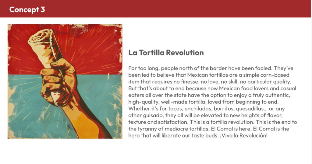 I debated whether to include this, after all, it never ran. But some ideas are too good to leave in a folder. This was one of three concepts I sold to an agency, and it’s still my favorite. The brief? Disrupt the California tortilla market, which has been monopolized by two legacy brands and a sea of mediocrity. The solution? A rallying cry. A bold, flavorful uprising. We called it The Tortilla Revolution. A campaign that positioned our product not just as better, but as a cause. Because let’s be honest: the tortillas sold in the U.S.? They deserve to be overthrown. The campaign never saw daylight, but I still wonder what would’ve happened if it had. Check out the manifesto and radio script below, see if you would’ve joined the revolution.